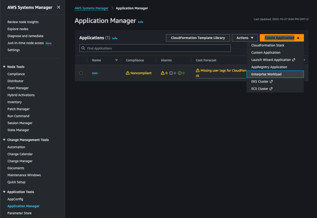 To proceed, go to AWS Systems Manager, and in the left-hand menu, select Application Manager. In the opened section, choose Create Application, then select Enterprise Workload.