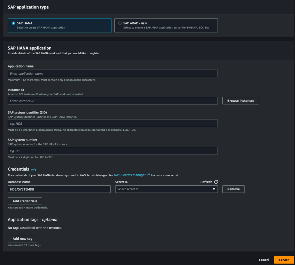 In the section that appears, enter your application and database information. Grant access to all the databases you are using, including SYSTEMDB. In the next step, create a new secret in AWS Secrets Manager and add it here you should include it as username and password.
