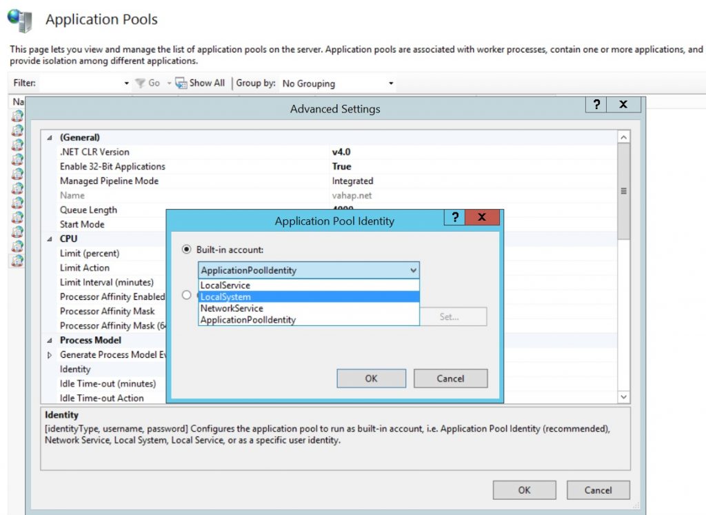 Cevaplarınız evet ise IIS tarafında çalıştırdığınız Application Pool’u, local admin yetkisinde bir kullanıcı oluşturup onunla ya da sistem kullanıcısıyla çalıştırmayı deneyin. Örneğin LocalSystem ile çalıştırabilirsiniz. Böylelikle bu sorununuz çözümlenecektir. IIS ve Application Pool’u restartlamayı unutmayın. IIS’e giriş yapın. Application Pool’a tıklayın. Açılan alanda domaini bulun ve sağ tıklayıp Advanced Settings tıklayın. Identity kısmında ApplicationPoolIdentity göreceksiniz. Aşağıdaki alanda olduğu gibi seçebilirsiniz.