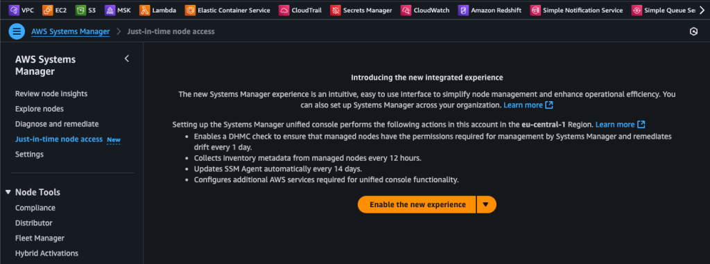 When you go to Just-in-time node access in Systems Manager and you haven’t used it before, you will be greeted with the following screen:
