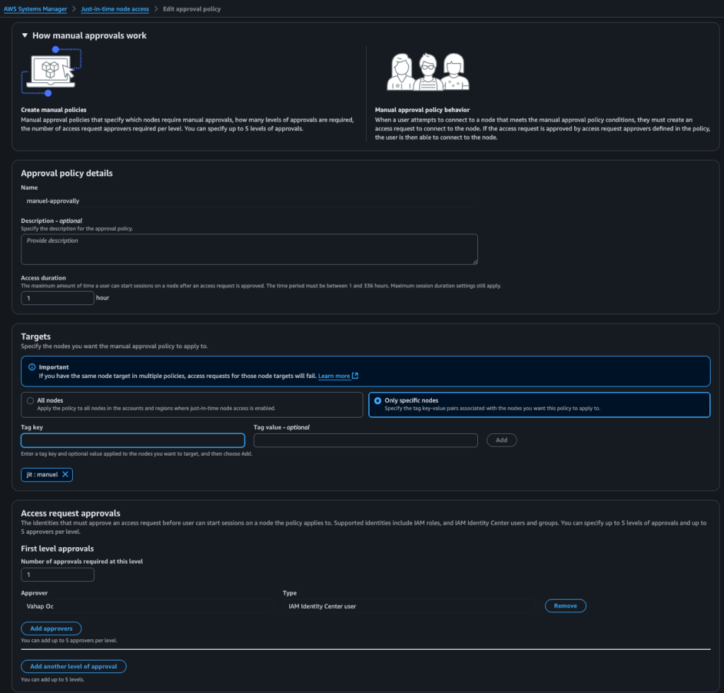 On April 29, 2025, AWS announced the JITNA (Just-in-time node access) feature to meet this need. With this feature, you can use it not only on your servers in AWS but also on your on-premises servers or servers in other cloud providers. The only requirement is that the AWS SSM Agent must be installed on the relevant servers, and the corresponding IAM role or IAM user (if outside AWS) must be defined.