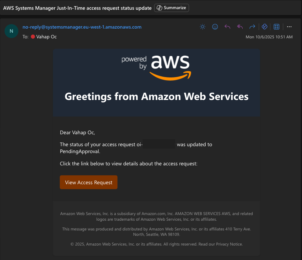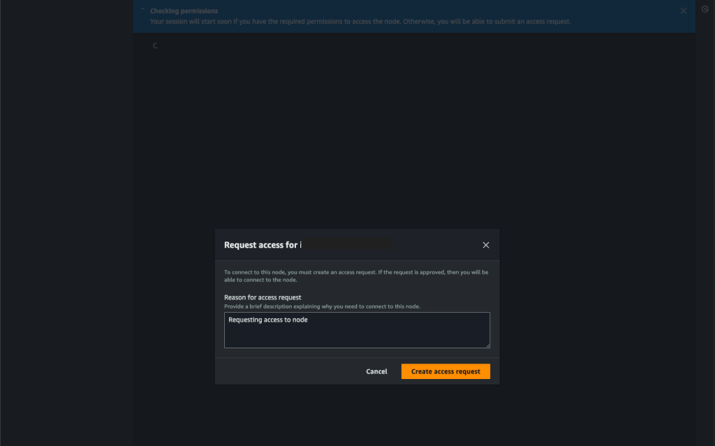 aws ssm start-access-request --targets Key=InstanceIds,Values=i-111111111111 --reason "Troubleshooting networking performance issue" --region eu-west-1