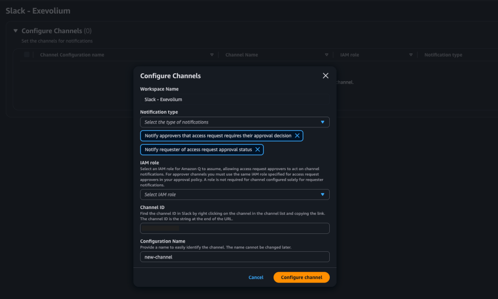As you can see below, two types of notifications can be delivered. Along with filling out this information correctly, it is important that you keep your Slack session open in the browser. When you click Configure channel, it will redirect you to Slack and request approval for Q Developer integration.
