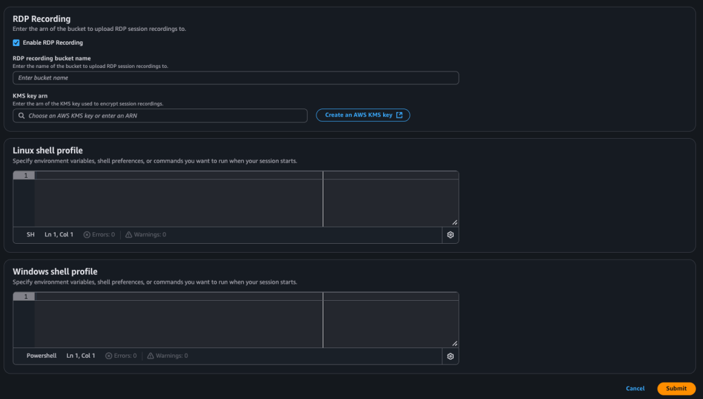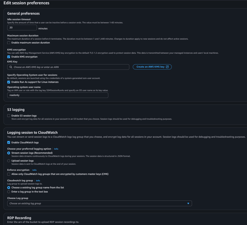 Another feature I enjoy using is shown below. If you have Windows servers in your environments, recordings of the session can be captured in .mp4 format, and these can be uploaded in encrypted form to the designated S3 bucket.
