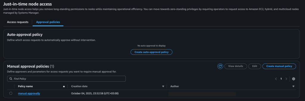 • Manual-Approval (account and region specific, with a limit of 50): This policy is used when neither auto-approval nor auto-deny rules apply. Requests are sent to designated decision-makers for manual review and approval. This policy can be applied to all or specific nodes.